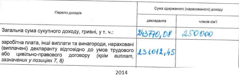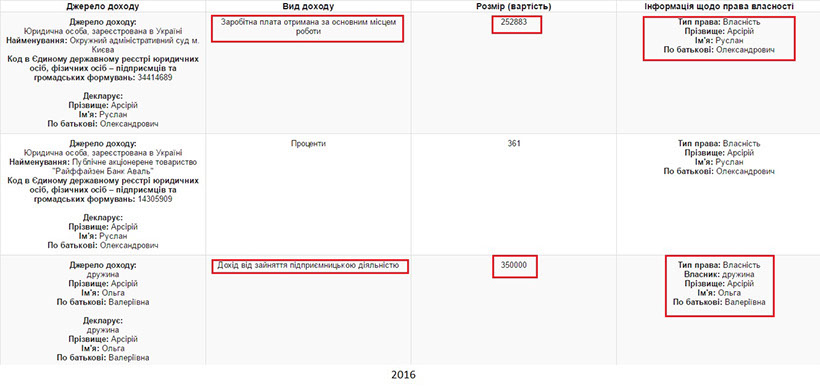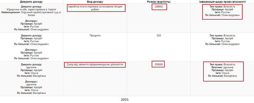 Звернемо увагу на ще один момент, який у нас викликає питання. Дружина судді – Арсірій Ольга Валеріївна, відповідно до даних декларацій заробила по 250 000 грн. у 2014-15 роках і 350 000 грн. у 2016 році.