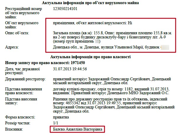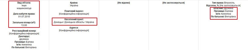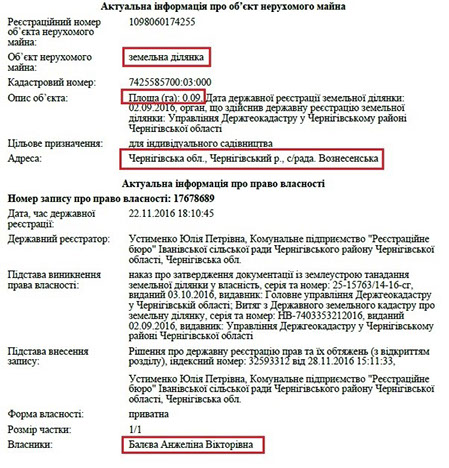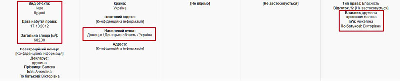 Його дружина — Анжеліна Балєва — теж задекларувала земельну ділянку в Чернігівській області, однак в іншому селі – Вознесенське. Решта майна пані Анжеліни залишилася у Донецьку. Там у її власності елітний офіс на 155 м², «інші будівлі» площею 682 м² та одне машино-місце.