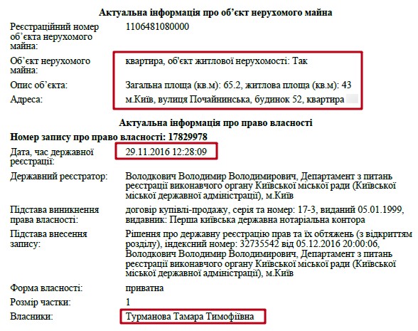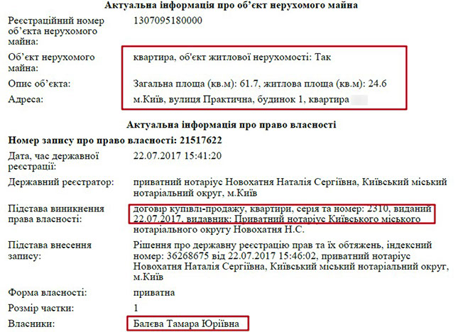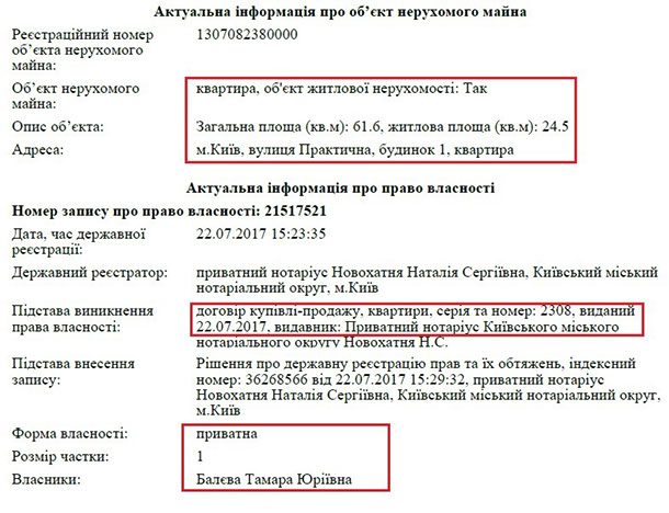 Теща прокурора теж має квартиру площею 61 м² в селі Петропавлівська Борщагівка. Сьогодні така квартира оцінюється в близько 30 тис. дол. Ще одну квартиру Тамара Тимофіївна має в Києві на Подолі, за адресою: вулиця Почайнинська, 52. Її площа 65 м². Вартість подібної квартири сьогодні – понад 80 тис. дол. Ну і ще одну квартиру в новобудові пані Тамара має в с. Чайки, що теж під Києвом. Її площа 57 м², а приблизна вартість 37 тис. дол.
