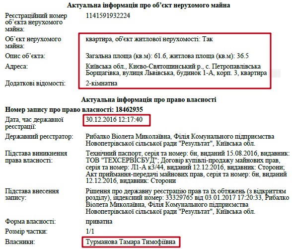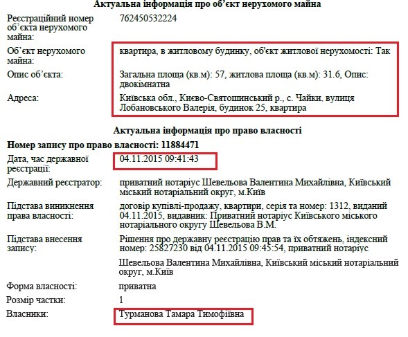 Але найбільш цінним майном володіють теща та тесть прокурора. Їм теж вдалося обзавестися декількома квартирами у новобудовах в Києві та Київській області. Зокрема, батько дружини Віктор Турманов володіє квартирою в селі Петропавлівська Борщагівка, що під Києвом, на вулиці Миру, 23-а. Площа його квартири 41 м², а її вартість бл. 25 тис. дол.