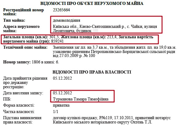 Найбільш цінним у власності Тамари Тимофіївни є будинок у селі Чайки площею 301 м². Придбала це житло пані Тамара у 2012 році. Подібні маєтки сьогодні коштують понад 200 тис. дол.