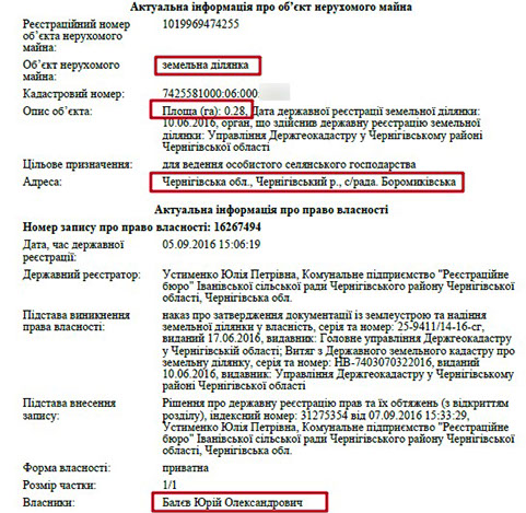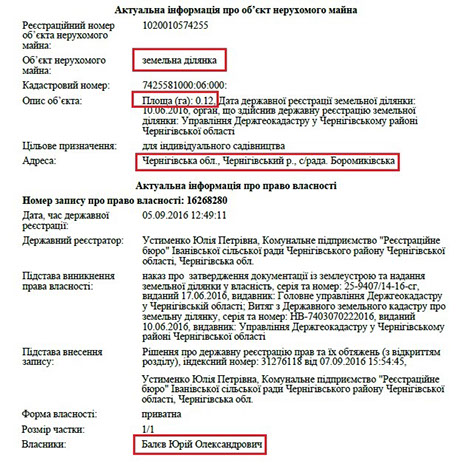 Сьогодні у безпосередній власності Юрія Олександровича Балєва лише дві земельні ділянки в Чернігівській області, куди він переїхав після захоплення Донецька. Крім того, вже у Чернігові Юрій Олександрович користується службовою квартирою площею 130 м². На цьому перелік нерухомого майна прокурора закінчується.
