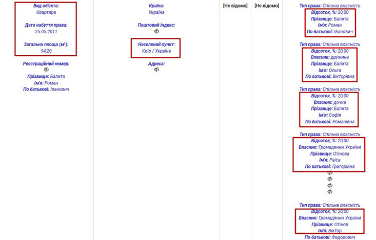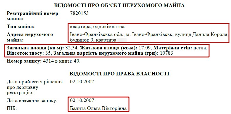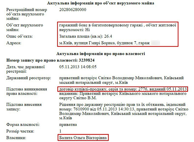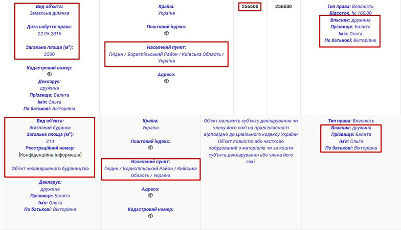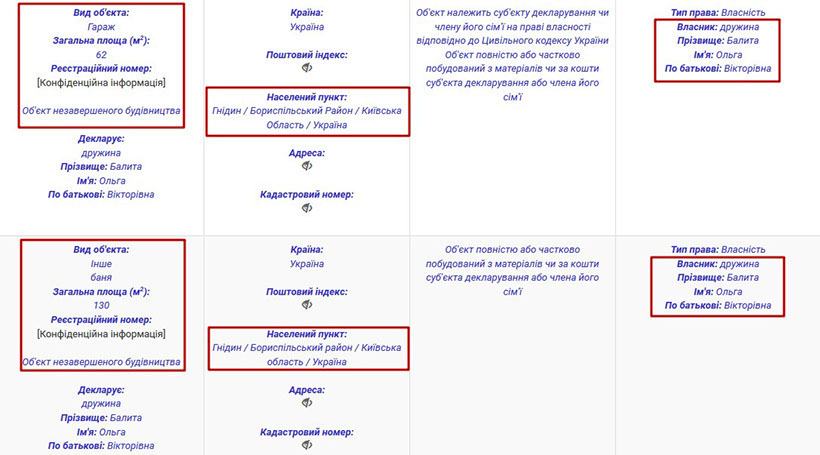 Власником решти задекларованого майна є дружина прокурора – Ольга Вікторівна Балита. Зокрема, вона володіє гаражним боксом у Києві, за адресою вулиця Бориса Гмирі, 7. Також у її власності квартира в Івано-Франківську.