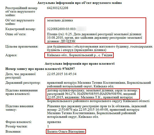 Із 2012 року Роман Іванович Балита є власником ще однієї земельної ділянки, яка розташована в с. Кучаків, що теж на Київщині. На жаль, точного розташування цих земельних ділянок нам з’ясувати не вдалося, оскільки вони відсутні у реєстрі речових прав на нерухоме майно.