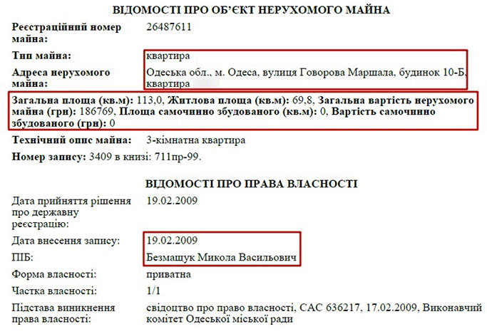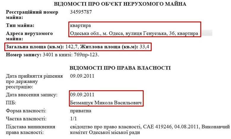 Микола Васильович Безмащук, 1944 року народження – батько прокурора. У його власності перебуває квартира площею 142 кв. м. у ЖК «Корона Нової Аркадії», що в престижному районі Одеси. Сьогодні ціни на таке нерухоме майно стартують від 160 тис. доларів. Інша квартира Миколи Васильовича має площу 113 кв. м. та знаходиться за адресою: вул. Маршала Говорова, 10-Б, що теж неподалік центру міста. Подібне житло сьогодні вартує 120 тис. доларів. Тож виникає запитання, звідки у Миколи Васильовича Безмащука кошти на придбання елітних квартир, вартістю близько 280 тис. доларів?! Можемо лише констатувати факт що ні він, ні його дружина (матір прокурора – Валентина Терентіївна Безмащук) бізнесом офіційно ніколи не займалися.