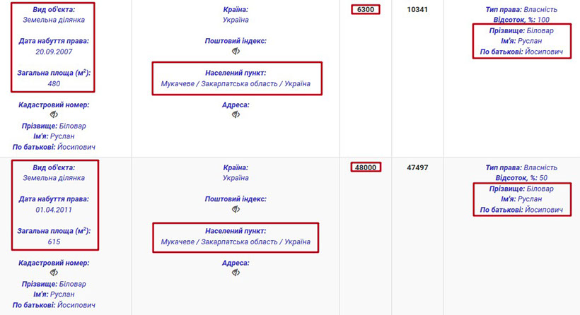 Ще одна земельна ділянка розташована в м. Мукачево, на вул. С. Клочурака. Власником цієї землі прокурор став у 2013 році, однак у декларації за цей рік її він не вказав. Окрім неї, Руслан Біловар задекларував ще дві ділянки в м. Мукачево. Одна з них, площею 615 кв. м., теж відсутня в декларації за 2013 рік, хоча її власником Руслан Йосипович став ще у 2011 році.