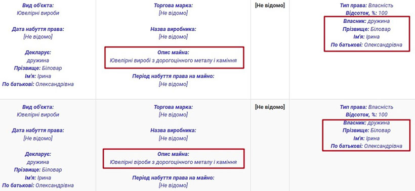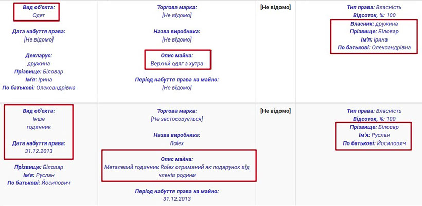 У подружжя Біловарів також досить багато цінного рухомого майна. Наприклад, Руслан Йосипович є власником колекції картин закарпатських художників і годинника Rolex. А от Ірина Олександрівна у своєму розпорядженні має верхній одяг із хутра та два ювелірні вироби з дорогоцінного каменю та металу.