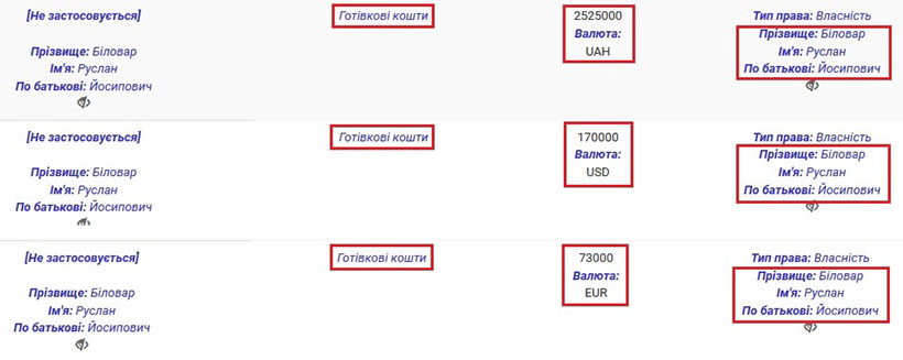 Окрім високих задекларованих доходів прокурора, вражають його заощадження. Руслан Біловар вказав 2,5 млн грн, 170 тис. дол. та 73 тис. євро готівки. Ще 520 тис. грн та 14 тис. дол. готівки задекларувала його дружина.