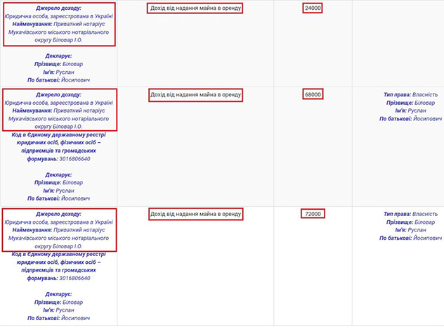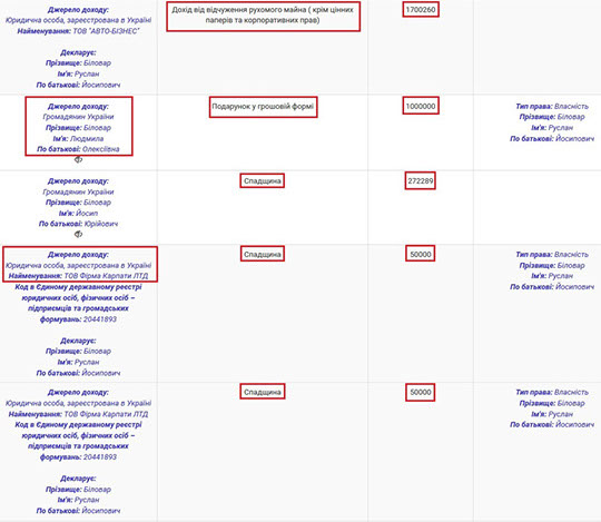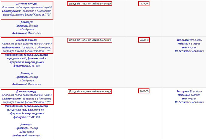 Однак тут є декілька цікавих моментів. Більшу частину цієї суми Руслан Біловар отримав від продажу авто (1,7 млн грн), подарунку від матері (1 млн грн) та спадщини (370 тис. грн). Але серед 4,5 млн грн є й інші доходи, наприклад здача майна в оренду. Так, протягом 2015-2017 років Руслан Біловар здавав офіс своїй дружині. І за це він отримав сумарно 164 тис. грн. Ще 578 тис. грн він отримав, здаючи майно в оренду ТОВ «Фірма «Карпати ЛТД», компанії, 100 % власником якої є матір прокурора.