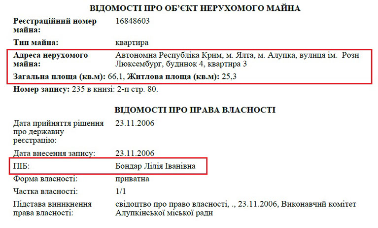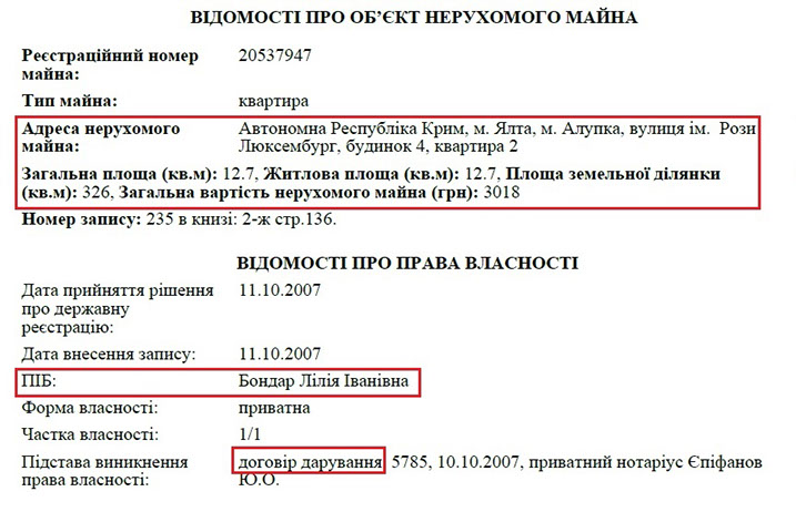 Сама ж Лілія Іванівна також може похизуватися чималою кількістю нерухомості. Окрім квартири площею 62 м2, якою вона володіє спільно з дочкою, має дружина судді у власності 3 квартири в столиці площею 80 м2, 45м2 та 23м2. Останню квартиру, яку, до речі, дружині судді подарували, ми не змогли знайти в декларації судді. Проте з такою кількістю нерухомості нескладно про щось «забути». Окрім цього має дружина судді і 2 квартири в окупованому Криму, а саме квартири площею 66 м2 та 12 м2 в Алупці. Зовсім не дивує той факт, що одну з цих квартир дружині судді – подарували.