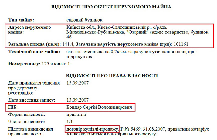 Окрім цього має дружина судді і дачу в садовому товаристві «Озерний» поблизу Києва площею 136 м2. Згідно реєстру речових прав, і дачу, і будинок в селі Крюківщина дружина судді успадкувала. Однак п’ятьма роками раніше, в 2007 році, сам суддя Сергій Бондар придбав садовий будинок по сусідству площею 141 м2. А отже на сьогодні родині Бондар належить два сусідні дачні будинки в Києво-Святошенському районі.
