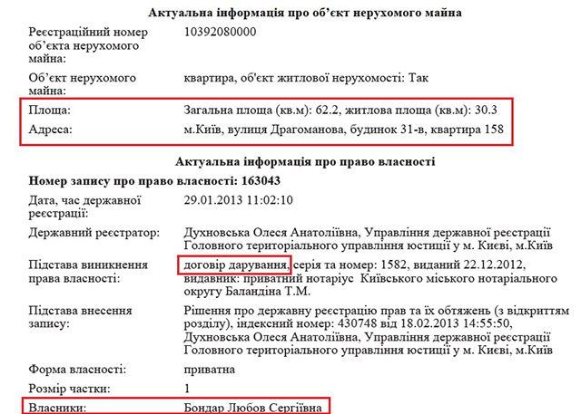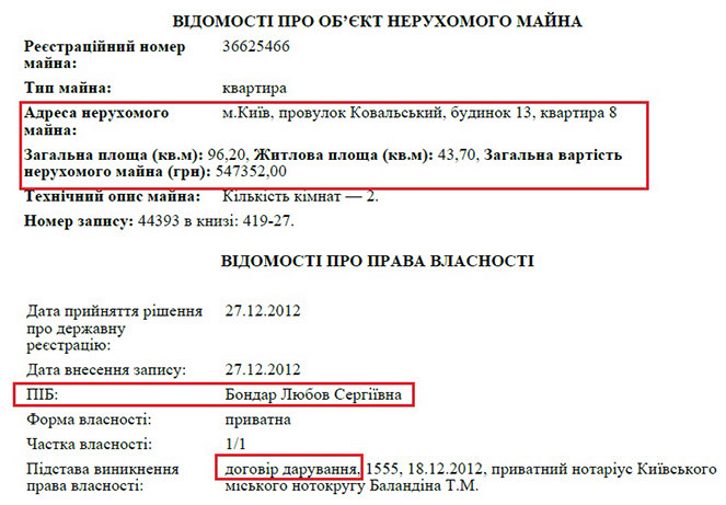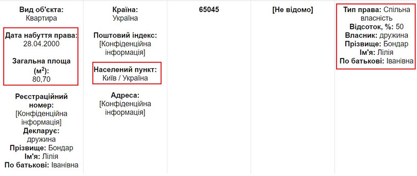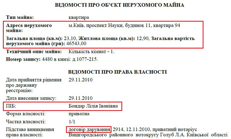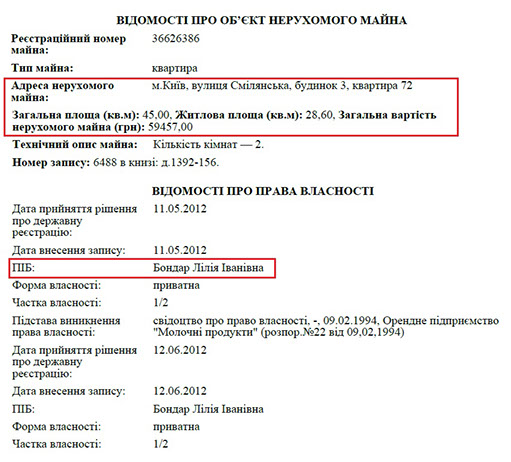 Родина судді Бондар, не дивлячись на скромні доходи, має в своїй власності цілих 7 квартир. Дві з них площею 96 м2 та 62м2 в Києві належать дочці судді. Обидві квартири їй подарувала мати та дружина судді Бондаря – Лілія Іванівна.