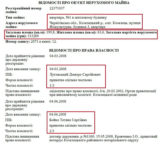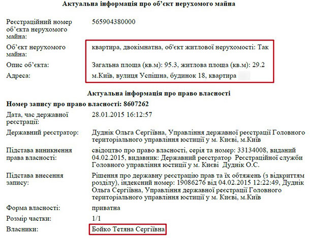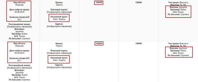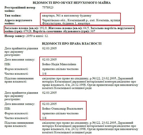 У реєстрі речових прав на нерухоме майно нам вдалося дізнатися, що Олександр Бойко володіє частиною квартири в смт. Козелець, вулиця Фізкультурна, 1. Частину цієї квартири площею 192 кв. м. суддя отримав у спадщину. Та найцікавіше, що суддя не вказав її у своїй декларації. Відсутня у декларації й інша квартира, яка розташована майже по-сусідству: смт. Козелець, вулиця Фізкультурна, 3. Частина цього житла площею 199 кв. м. перебуває у власності дружини судді.