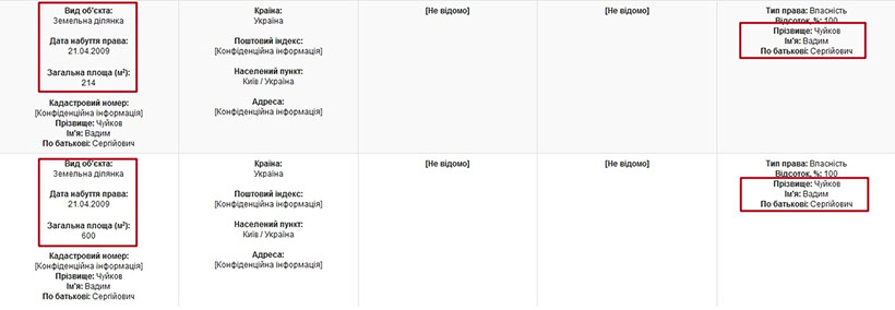 Також у власності Вадима Чуйкова перебуває 6 соток землі у Києві. Ще 11 соток землі є у власності дружини прокурора у с. Вороньківка, Вишгородського району. Однак через відсутність цих ділянок у реєстрі нерухомого майна ідентифікувати їхнє розташування нам не вдалося.