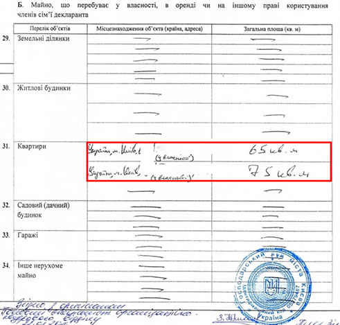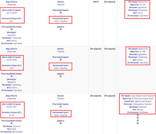Також ми виявили невідповідності щодо квартир родини Юрія Вікторовича. Його дружина Ольга Семенець була власницею трьох квартир: 86,1 кв. м, 57,8 кв. м, 81,22 кв. м. Тоді як у паперових деклараціях зазначаються лише дві та з іншими площами.