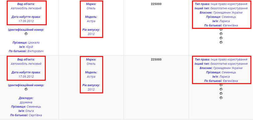 Він разом з дружиною також користується автомобілем OPEL Astra 2012 року, записаним на тещу Семенець Ларису Євгенівну. Цікаво, що право користування вони набули одночасно в 2012 році. Однак паперова декларація за 2012 рік не містить такої автівки.