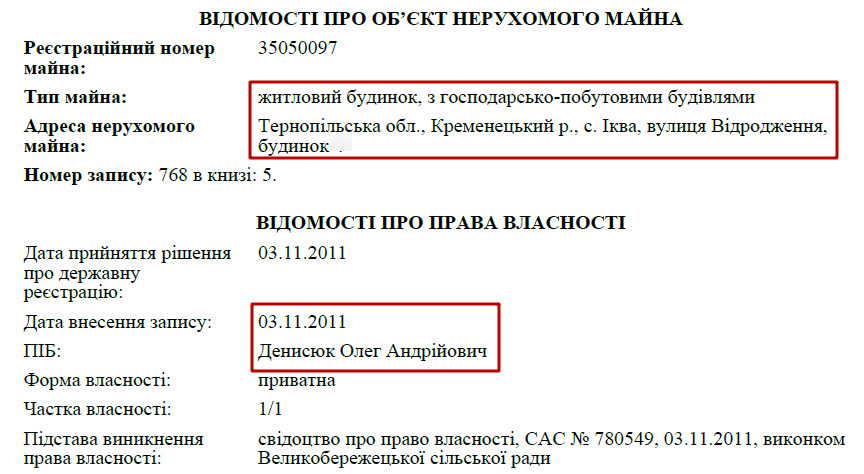 У власності Олега Андрійовича перебуває будинок у с. Іква, що у Кременецькому районі. Площа цього житла 166 кв. м. і обійшлося воно йому у 188 тис. грн станом на 2011 рік. А от про походження землі під будинком не відомо нічого, але обійшлася вона прокурору лише в 1 гривню. До речі, це житло Олега Денисюка вже потрапляло у кадри журналістів.