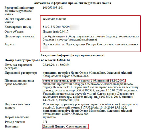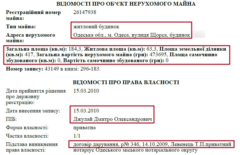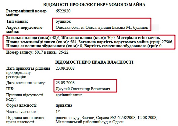 У реєстрі речових прав на нерухоме майно нам також вдалося більш детально дізнатися про статки родичів судді. Зокрема, будинком в Одесі володіє його син. Площа цього житла – 184 кв. м.