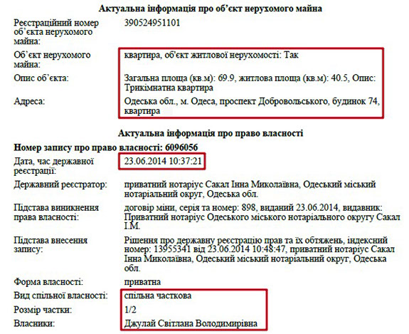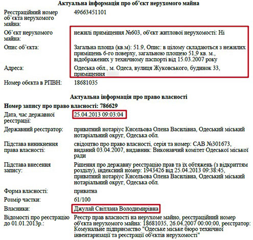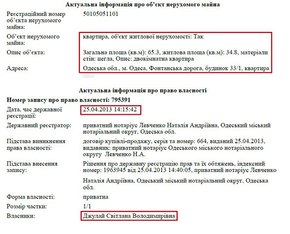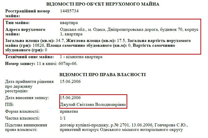 Джулай Світлана Володимирівна – колишня або нинішня дружина судді теж має достатньо майна. З реєстру прав на нерухоме майно ми дізналися, що вона володіє 3 квартирами та 2 нежитловими приміщеннями в Одесі.