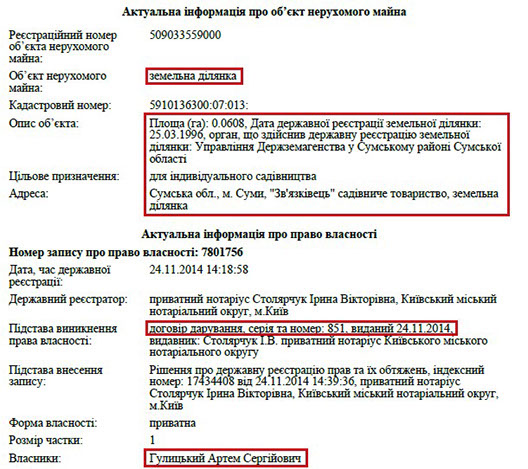 Син прокурора – Артем Сергійович Гулицький, 1991 року народження, теж нещодавно обзавівся житлом у Києві. У 2015 році йому подарували частину квартири площею 80 кв. м. за адресою просп. Петра Григоренка, 11-А. За рік до цього, у 2014 році, він отримав інший подарунок у вигляді земельної ділянки в Сумах.
