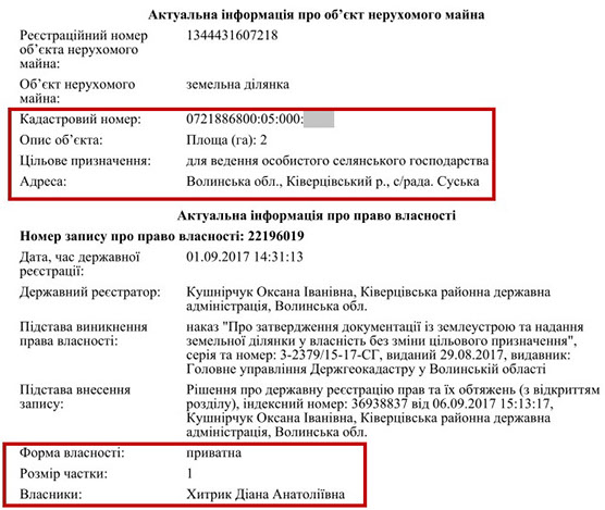 Зазначимо, що з нерухомості у власності судді зареєстрована лише одна земельна ділянка. Потребу в ній суддя не зміг пояснити на співбесіді, лише зазначив, що косить там траву. Проживає він у квартирі дружини на 142 кв. м. у Луцьку. Діана Хитрик придбала її у 2013 році за 592 000 грн.