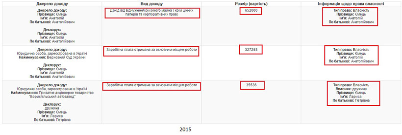 Проаналізувавши майнові декларації Анатолія Ємця за 2013, 2014 та 2015 роки, бачимо, що основним доходом родини судді є його заробітна плата, але в 2013 та 2015 роках суддя мав дохід і від продажу нерухомого чи рухомого майна. Доходи ж його дружини - єдиного задекларованого члена родини – в кілька разів менші і складаються лише із заробітної плати.