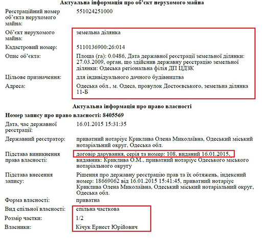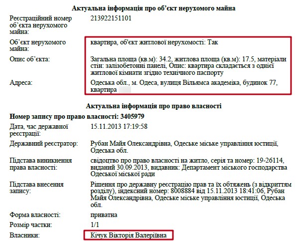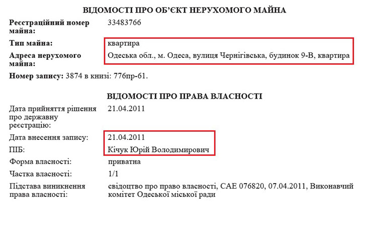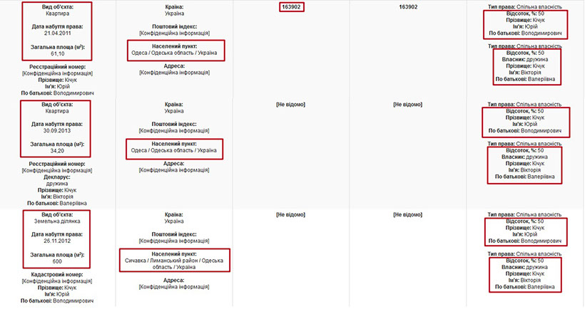 Самі ж Юрій та Вікторія Кічук теж мають достатньо нерухомості. Квартира площею 61 кв. м. розташована в Одесі за адресою вул. Чернігівська, 9-В. Сьогодні вартість подібної квартири становить майже 74 тис. доларів. Хоча в декларації вказана ціна лише 163 тис. грн. Інша квартира площею 34 кв. м. розміщена за адресою м. Одеса, вулиця Академіка Вільямса, 77. Натомість розташування земельної ділянки нам дізнатися не вдалося.