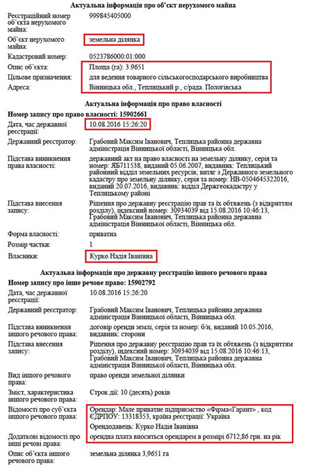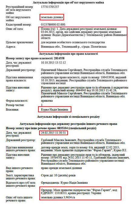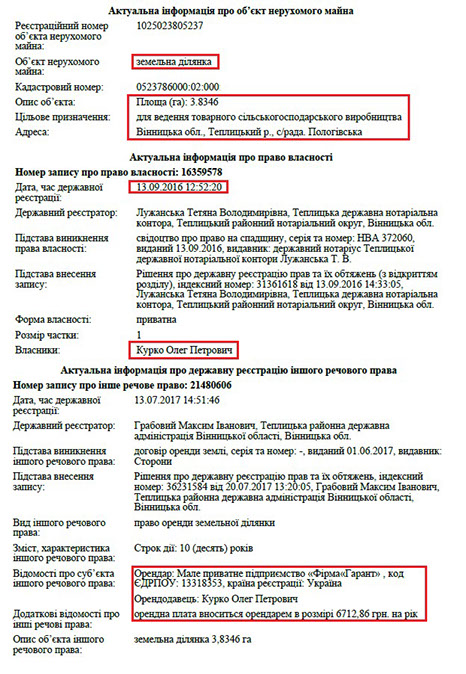 Також у 2016 році Олег Петрович Курко отримав землю в селі Пологи, яку передав в оренду компанії «Фірма Гарант». Майже ідентичні 2 ділянки отримала і матір судді та теж здала їх в оренду цій компанії.