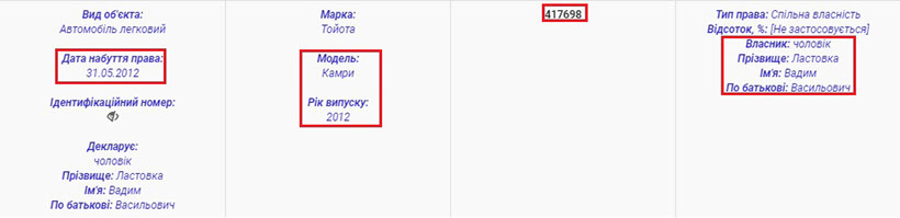 Цікавою є також ситуація з рухомим майном родини: на наступний день після звільнення з органів прокуратури чоловік судді придбав автомобіль Toyota Camry 2012 р. в., який обійшовся йому більш ніж 50 тис. доларів по тогочасному курсу. Вже через рік, у 2013 році, Вадим Ластовка витратив ще щонайменше 95 тис. доларів на купівлю нового Mercedes-Benz ML 350. У 2017 році автопарк колишнього прокурора поповнився ще й новим BMW 520D, вартістю близько 70 тис. доларів.