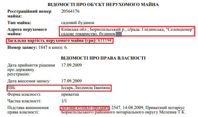 Іншою нерухомістю родини володіє 68-річна мати судді – Людмила Іванівна Іссарь. Зокрема, саме матір Нелі Дмитрівни приватизувала службову квартиру площею 120 кв. м. по вул. Срібнокільська, 12.