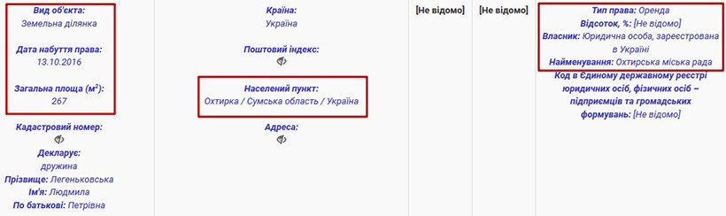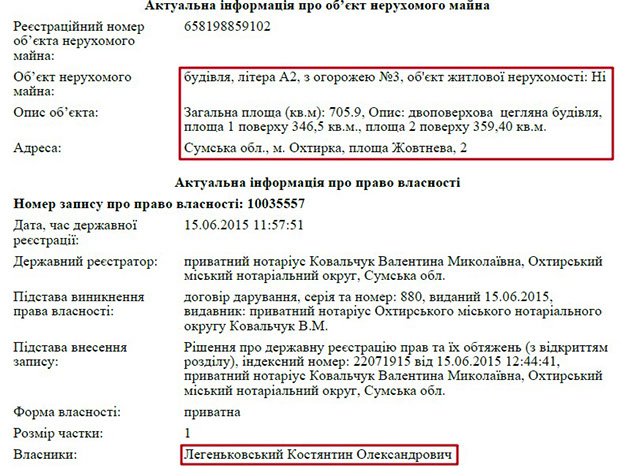 Ще 3 земельні ділянки пані Людмила орендує у міськради. А власником приміщення на цих ділянках за адресою: площа Жовтнева, 2 є один із синів прокурора – Костянтин Легеньковський. Площа цього нежитлового приміщення – 705 кв. м., а в ньому зареєстровано колективне підприємство «Лікувально-консультативний центр». Місцеві ЗМІ повідомляють, що ця нерухомість стала власністю членів родини прокурора у березні 2011 року на підставі рішення виконавчого комітету Охтирської міськради.