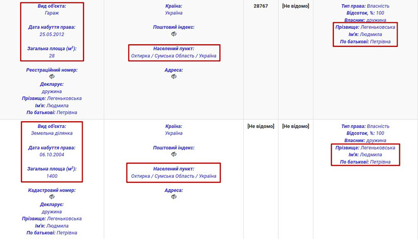 В Охтирці вона є власником ще однієї земельної ділянки та гаража.