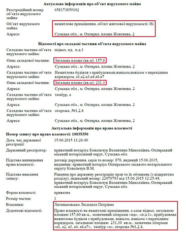 А от більшість нерухомості дружини розміщена в Охтирці. Зокрема у її власності житловий будинок площею 126 кв. м. Цікаво, що в декларації за 2014 рік вказана площа цього будинку – 110 кв. м.