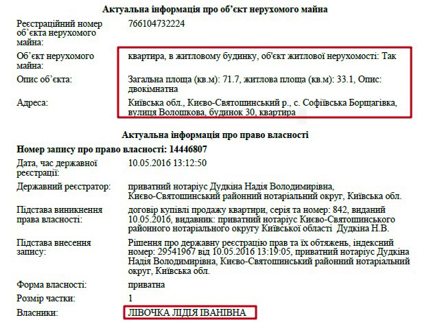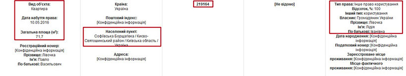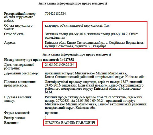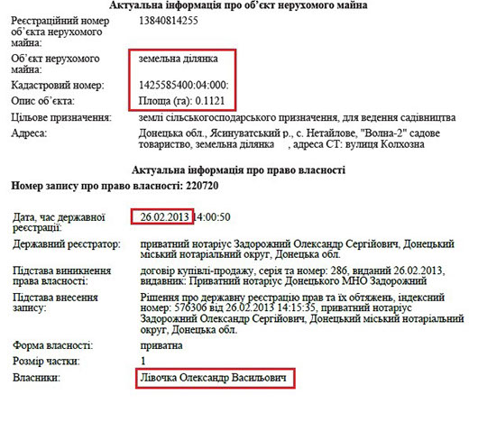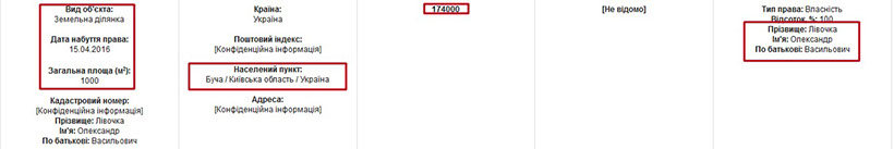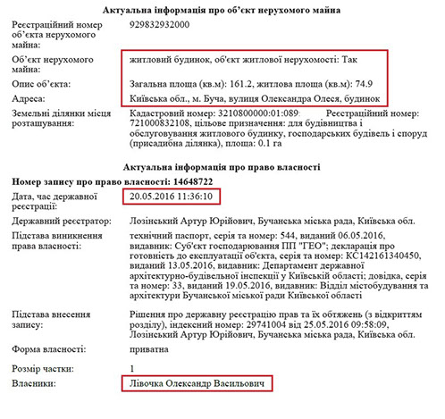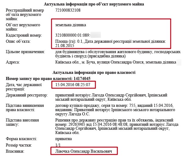 З Реєстру речових прав на нерухоме майно нам стало відомо, що Лівочка Олександр Васильович 15 квітня 2016 придбав земельну ділянку у мальовничому районі міста Буча неподалік Києва. У декларації О.Лівочка зазначив, що вартість землі лише 174 тис. грн., що, на нашу думку, явно не відповідає ринковим цінам.