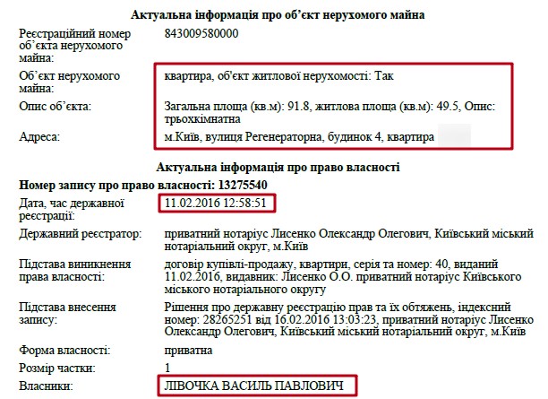 Крім дорогих придбань прокурора, купівлею нерухомості займаються його батьки-пенсіонери. Наприклад, його батько Василь Павлович придбав квартиру площею 91 м² на Регенаторній, 4. Це є відомий житловий комплекс «Комфорт Таун», де подібна квартира коштує бл. 100 тис. дол. У 2016 році Лівочка В. П. придбав ще одну квартиру загальною площею 40,4 м² в селі Софіївська Борщагівка у передмісті Києва. Середня ціна подібного житла за цією адресою – 40 тис. дол. У цьому ж будинку квартиру придбала і матір прокурора Лівочка Лідія Іванівна. Житлом загальною площею 71.7 м² сьогодні користується брат прокурора, а вказана у його декларації вартість цієї квартири – 219 тис. грн, що навряд чи відповідає дійсності, адже схожа квартира в цьому будинку коштує бл. 70 тис. дол.