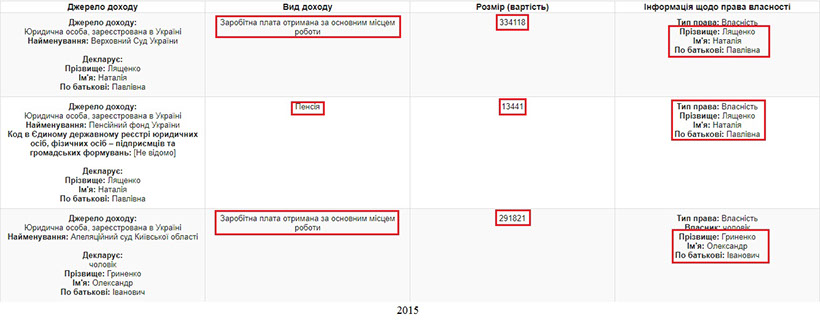 Щодо майна та доходів Наталії Лященко, то, проаналізувавши декларації судді за 2013, 2014, 2015 та 2016 роки, ми бачимо, що основними доходами Наталії Павлівни та її чоловіка були суддівські заробітні плати, а також матеріальна допомога, яку подружжя отримувало всі ці роки.