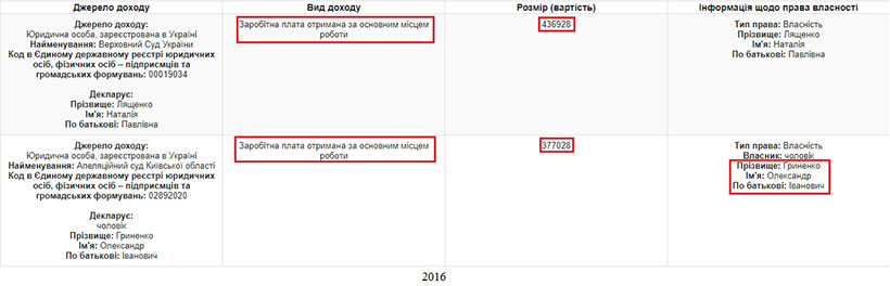 Цікавою є також Декларація родинних зв’язків судді Лященко. З неї дізнаємось, що чоловік Наталії Павлівни, Олександр Іванович Гриненко також є суддею і працює в Апеляційному суді Київської області.