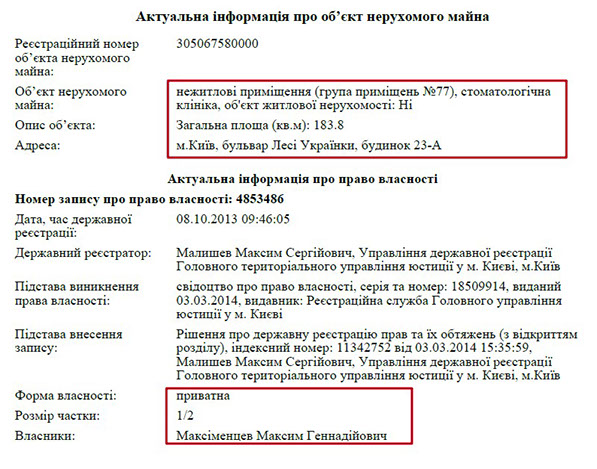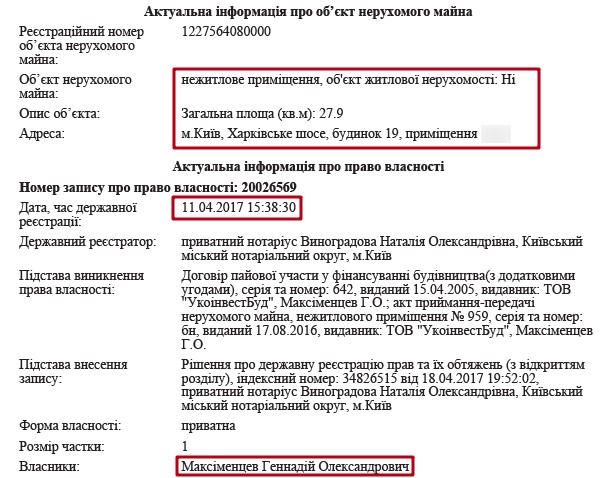 Не менше майна є і в чоловіка прокурорки. У його власності офіс за адресою бульвар Лесі Українки, 23-А (по сусідству із вище згаданою квартирою дружини). Цим приміщенням Максим Геннадійович володіє разом із Білецькою Нелею Іванівною.
