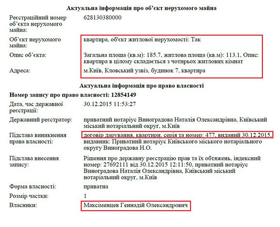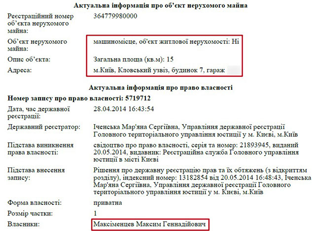 Окрім цього, у 2014 році Максим Геннадійович придбав гараж в елітному будинку в Києві за адресою Кловський узвіз, 7. От тільки квартири в цьому будинку Максіменцев Максим не має. Хоча відсутня вона лише в декларації. Натомість ми дізналися, що житлом на 185 м² у цьому будинку володіє 78-річний батько Максима – Геннадій Олександрович Максіменцев. Дану квартиру йому подарували у 2015 році.
