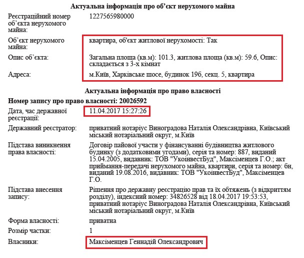 Також Геннадій Олександрович Максіменцев, 1939 року народження, у 2017 році придбав квартиру площею 101 м² та гараж за адесою Харківське шосе, 19-б. Подібне житло сьогодні коштує майже 2 млн грн.