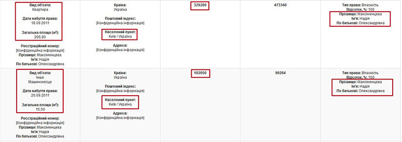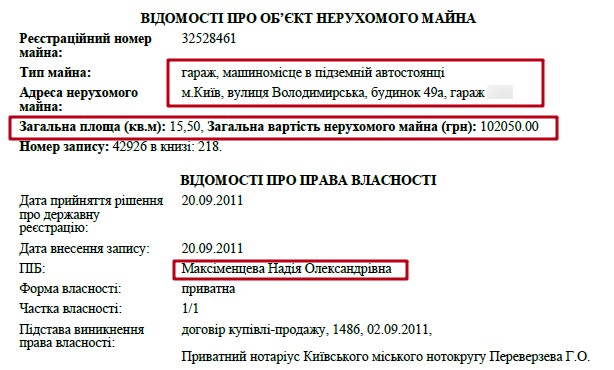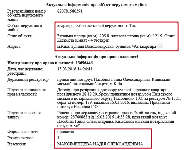 У власності прокурора Надії Максіменцевої є квартира та гараж в елітному будинку в центрі Києва за адресою вул. Володимирська, 49А. Це доволі відома будівля, адже квартирами тут володіли Віктор Янукович, Віктор Пшонка та багато інших одіозних персон. Сьогодні подібна квартира в цьому будинку коштує майже 1 млн доларів. Вказана ж вартість квартири у декларації прокурорки є набагато меншою.