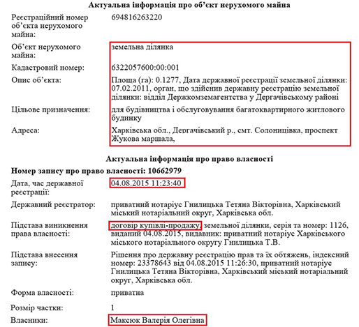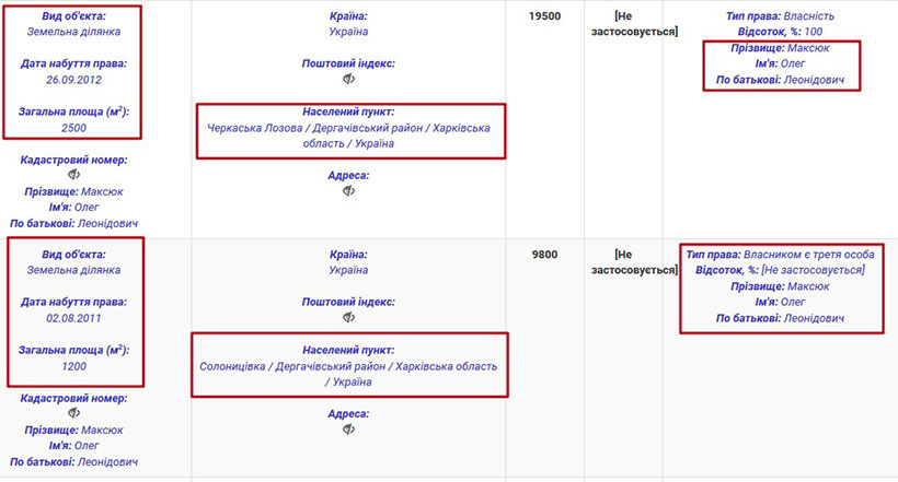У тому ж населеному пункті пані Валерія має земельну ділянку у приватному секторі, де вже починають будуватися будинки. Прокурор теж має землю у Солоницівці, однак, вона відсутня у реєстрі речових прав на нерухоме майно. Тож її місце розташування, на жаль, не відоме. Ще одна ділянка Олега Максюка знаходиться у с. Черкаська Лозова, що теж неподалік Харкова.