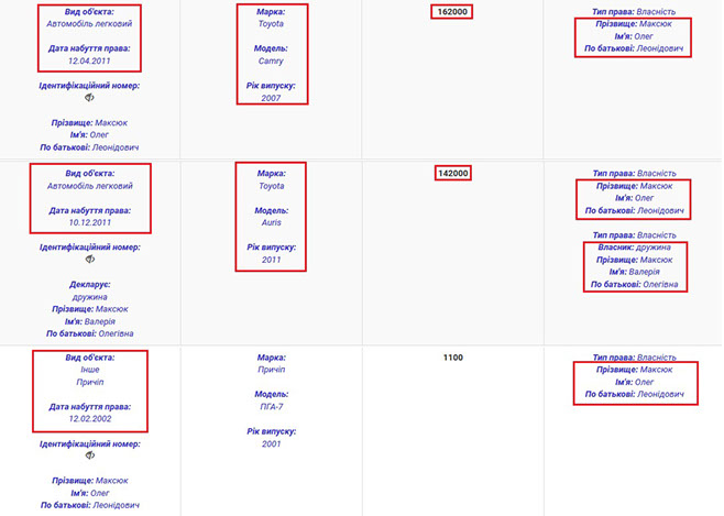 Якщо говорити про рухоме майно, то у власності подружжя є два авто та причіп. Зокрема у 2001 році Олег Леонідович придбав Toyota Camry 2007 року за 162 тис. грн. У тому ж 2011 році подружжя придбало новеньку Toyota Auris за 142 тис. грн.