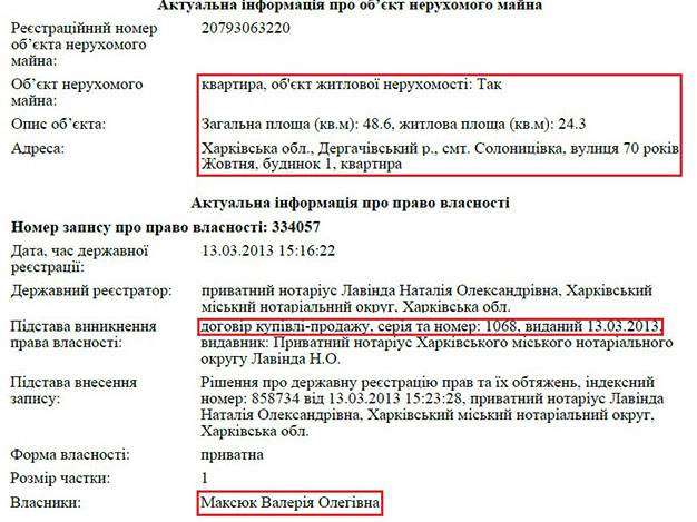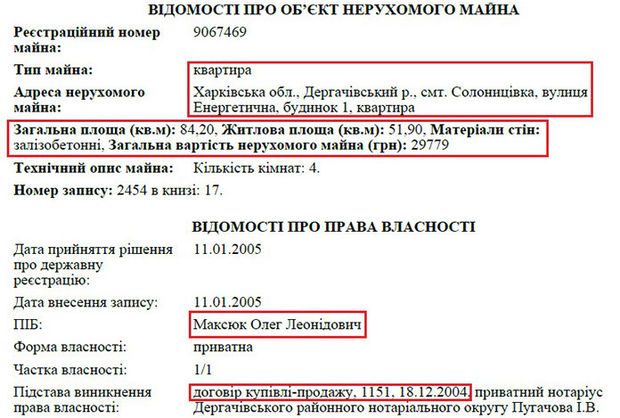 Не менше питань до прокурора і з приводу його статків. У безпосередній власності Олега Максюка квартира площею 84 кв. м. у смт. Солоницівка, що неподалік Харкова. Це житло він придбав у 2004 році. Іншу квартиру у 2013 році придбала Валерія Максюк. Площа цього житла – 48 кв. м.