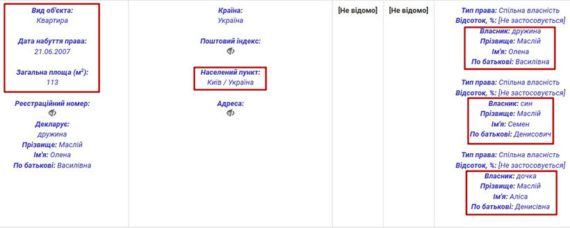 Ще однією квартирою Олена Маслій володіє разом зі своїми неповнолітніми дітьми. Площа цього житла – 113 кв. м. У декларації прокурора також вказані ще одна земельна ділянка, підвал та гараж.