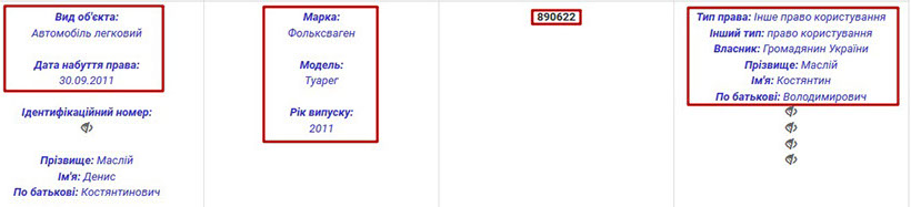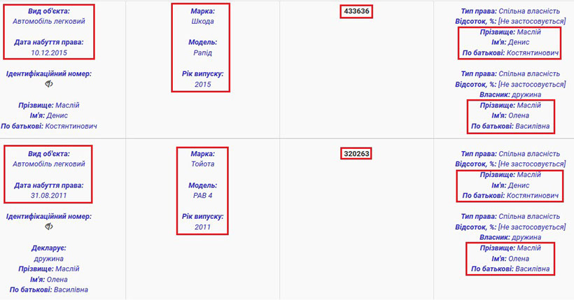Вражає і вартість автомобілів, якими володіє та користується прокурорське подружжя. Денис та Олена у 2011 році придбали нову Toyota Rav 4. Обійшлося їм це авто у 320 тис. грн. У 2015 році обоє придбали новеньку Skoda Rapid за 433 тис. грн. Окрім цього, Денис Маслій має право користуванням автомобілем свого батька – теж новеньким Volkswagen Touareg 2011 року, який придбав у тому ж році за 890 тис. грн!