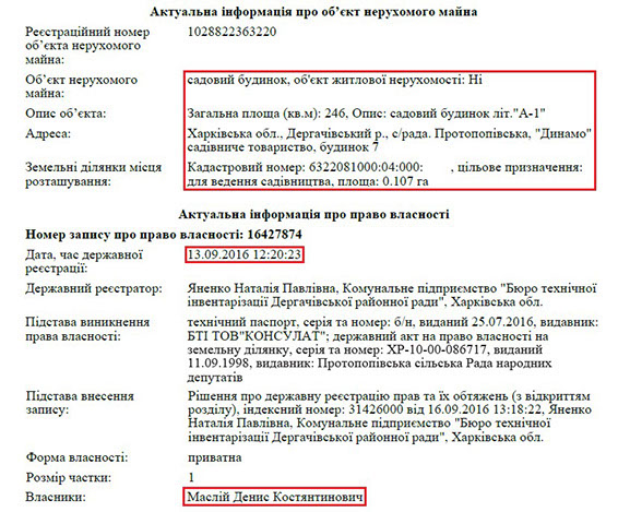 У безпосередній власності Дениса Маслія з 2016 року є будинок та земля під ним у с. Протопопівка, що неподалік Харкова. Загальна площа цього житла 246 кв. м. Окрім цього, прокурор разом із дружино є власниками ще 6 соток землі у цьому ж селі.