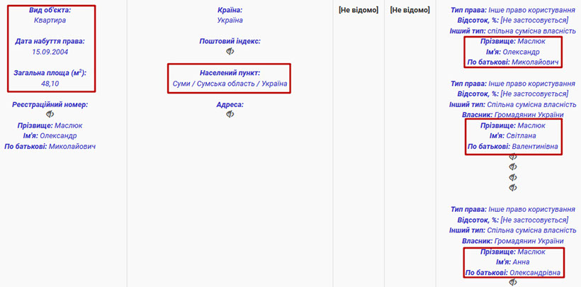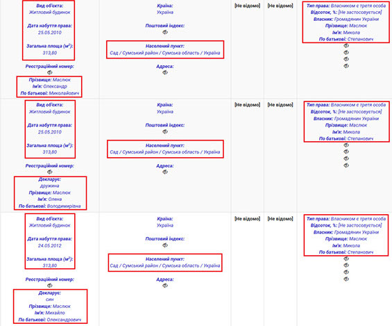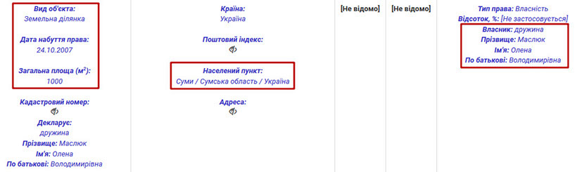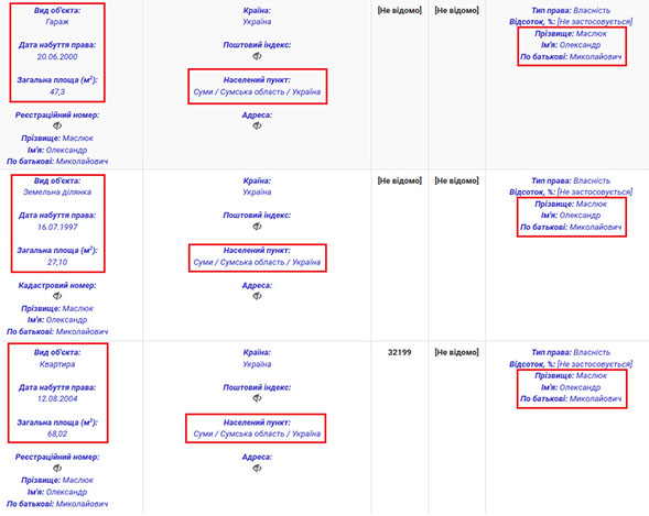 Серед іншого нерухомого майна у власності прокурора дві квартири, гараж та земельна ділянка в Сумах. Цікаво, що однією з квартир він володіє разом із своєю дочкою Анною Олександрівною Маслюк, яка працює прокурором Сумської місцевої прокуратури. У власності нинішньої дружини прокурора лише одна земельна ділянка в Сумах. Її площа 1000 кв.м.