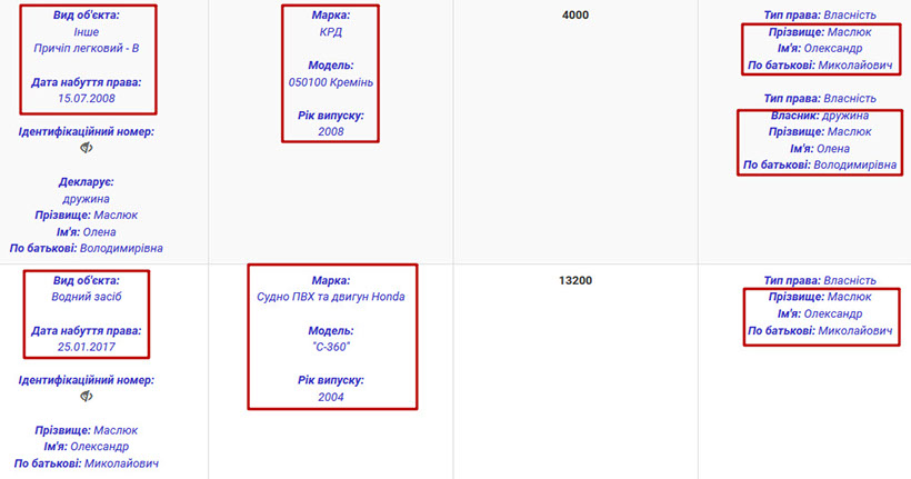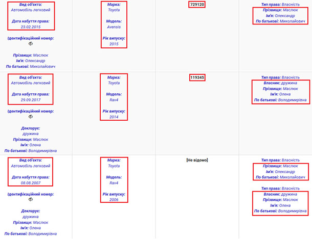 У власності родини прокурора є також достатньо дорогі автомобілі. Наприклад, Олександр Миколайович Маслюк у 2015 році придбав новеньку Toyota Avensis за 729 тис. грн. Дружина прокурора Олена Володимирівна Маслюк у 2017 році стала власницею Toyota Rav4 2014 року випуску. Задекларована вартість авто – 119 тис. грн, хоча сьогодні таке авто коштує майже 20 тис. доларів. Також подружжя володіє ще однією Toyota Rav4, в цьому випадку 2006 року випуску. Власниками авто вони стали в 2007 році, тобто у випадку купівлі – вони придбали автомобіль майже новим. Також у власності подружжя причіп та човен.