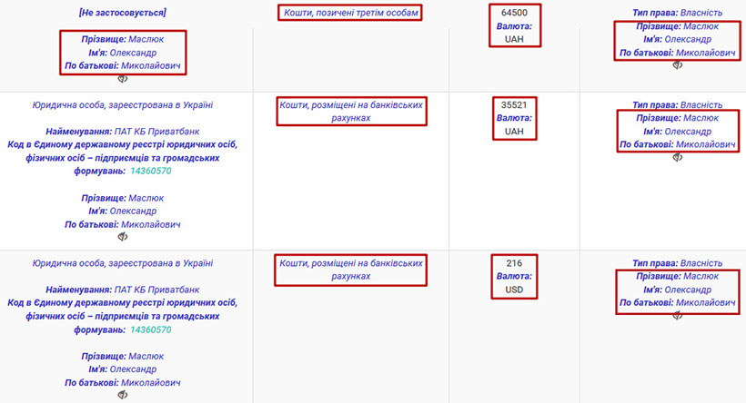 Вдалося родині прокурора доволі багато заощадити. Олександр Миколайович Маслюк на банківському рахунку має 35 тис. грн та 216 доларів, а також має 150 тис. грн готівки. Окрім цього, Олександр Миколайович позичив третій особі 64 тис. грн. А от скільки заощадила дружина прокурора – невідомо, адже вона не надала своєму чоловіку інформацію з приводу цього.